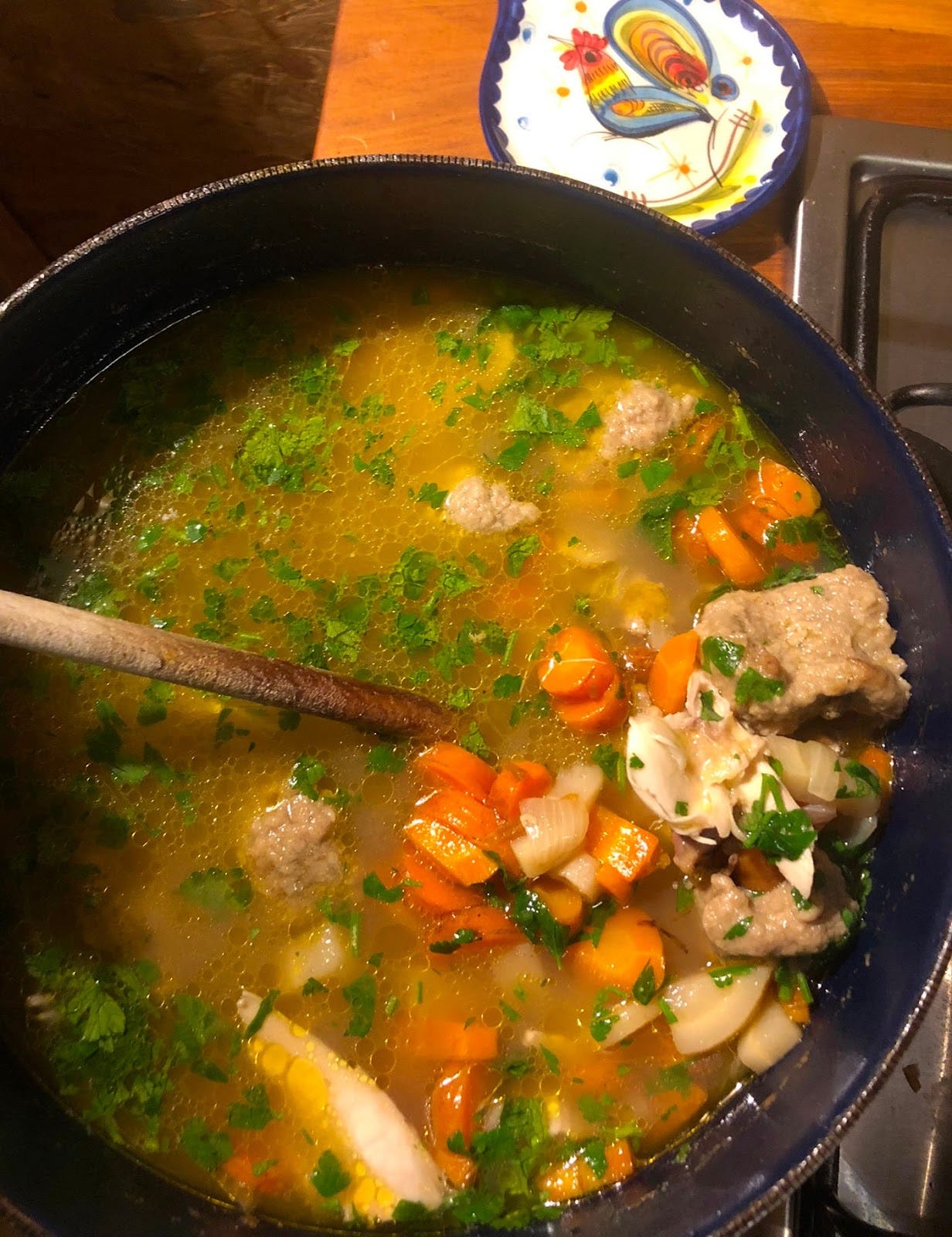 It’s almost ten by the time everything is washed, chopped, and salted. The cast-iron pot is placed on the wood stove, where it will humidify our home with the lovely aroma of chicken broth as we settle into our new life as a family of four.